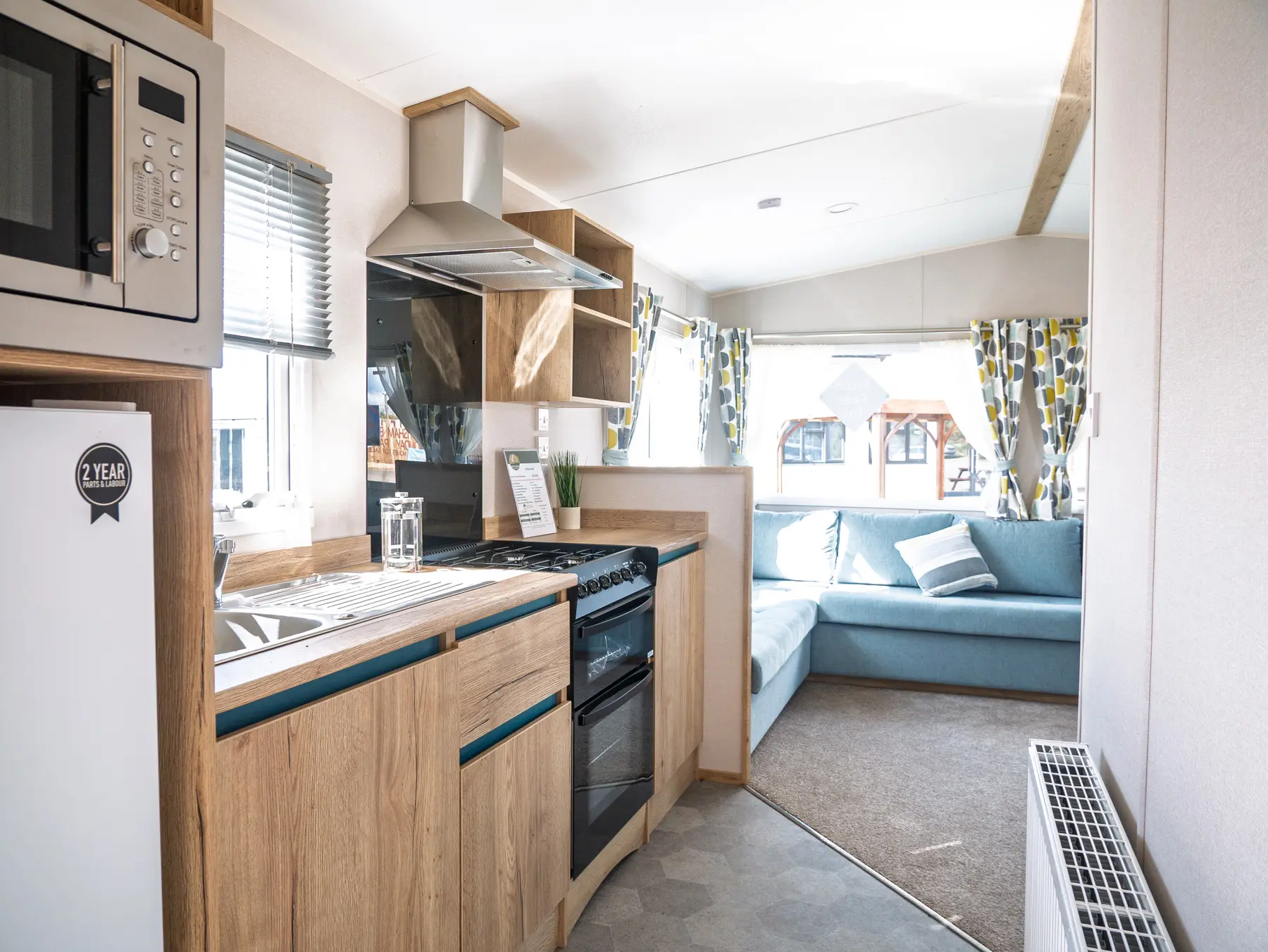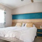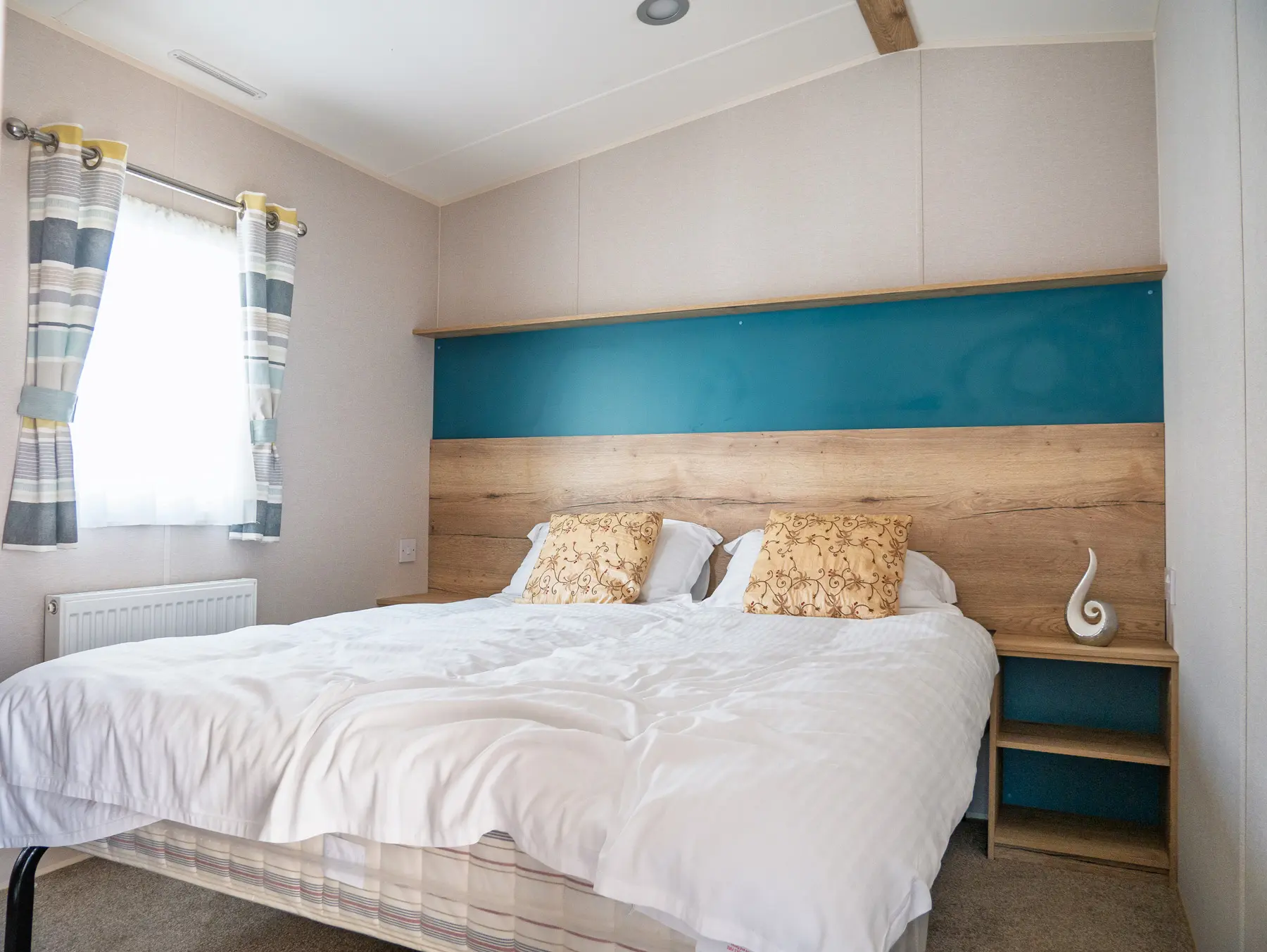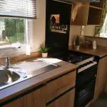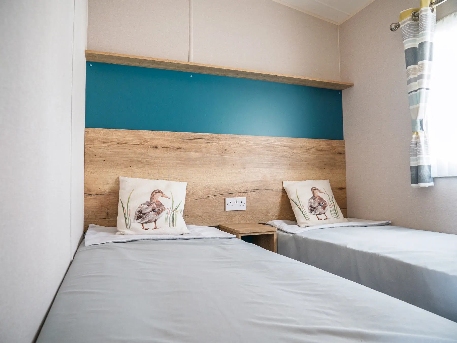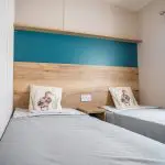 The wood effect continues through into the bedrooms with fitted wardrobes, bedside tables and headboards. The main bedroom boasts a king size bed and the twin bedroom(s) come with 2ft 6″ mattresses, all mattresses have three times more filling and a durable exterior cover.