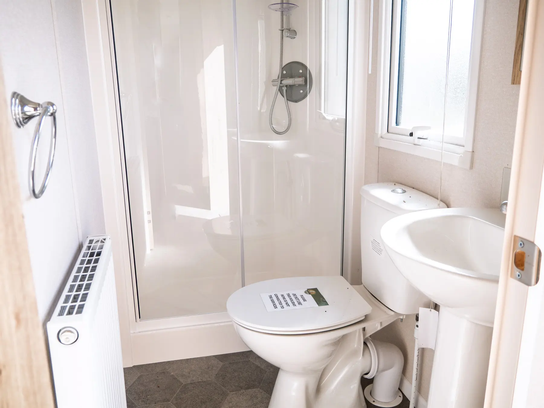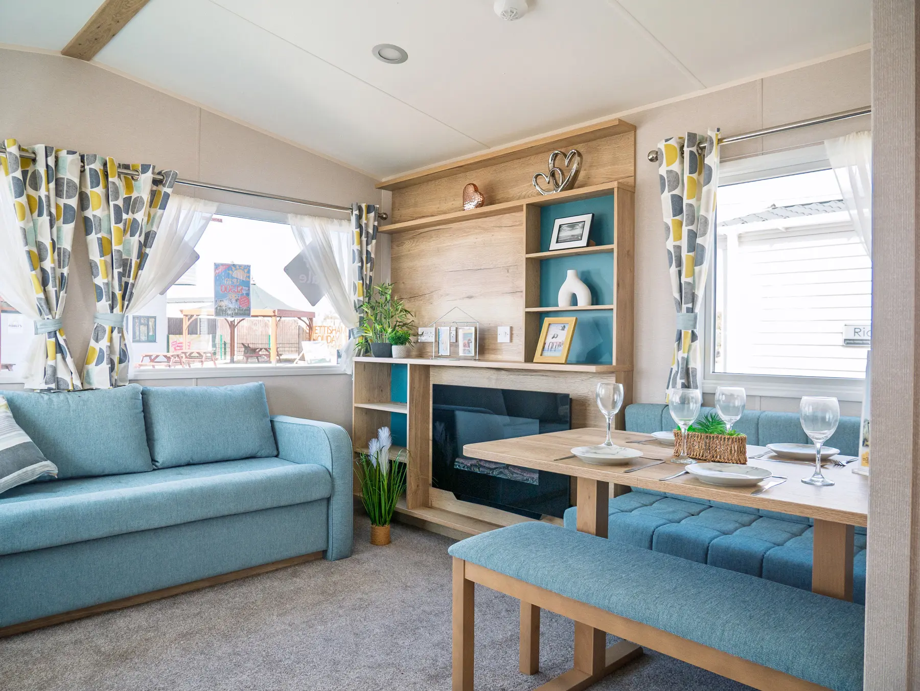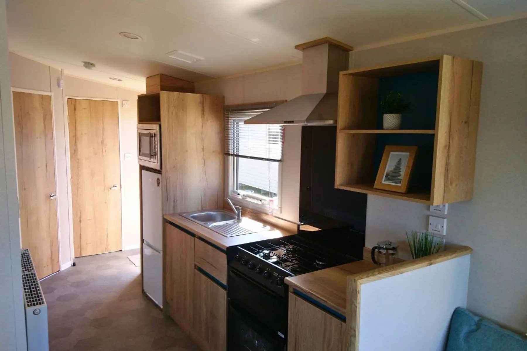 The wood effect continues through into the bedrooms with fitted wardrobes, bedside tables and headboards. The main bedroom boasts a king size bed and the twin bedroom(s) come with 2ft 6″ mattresses, all mattresses have three times more filling and a durable exterior cover.