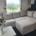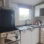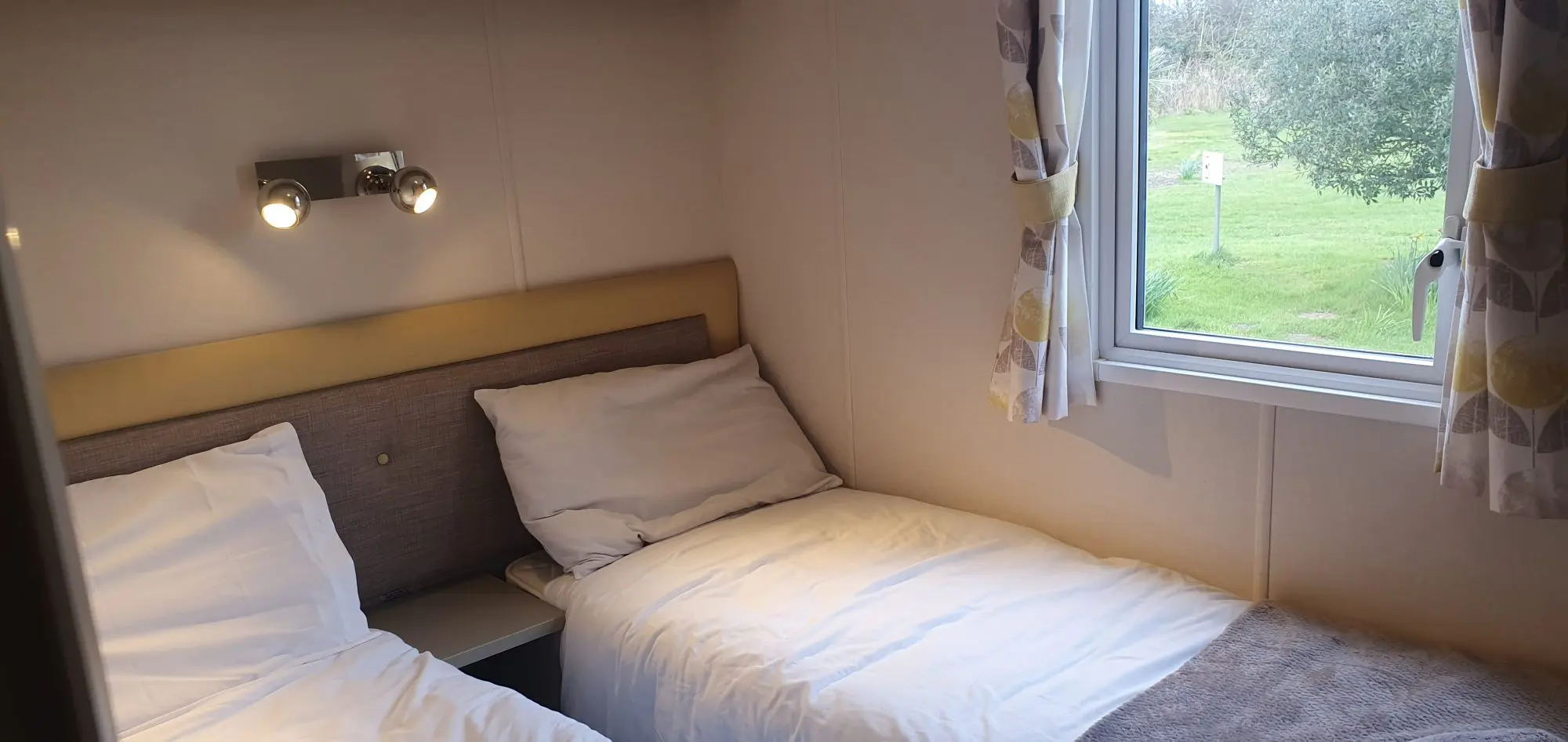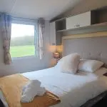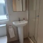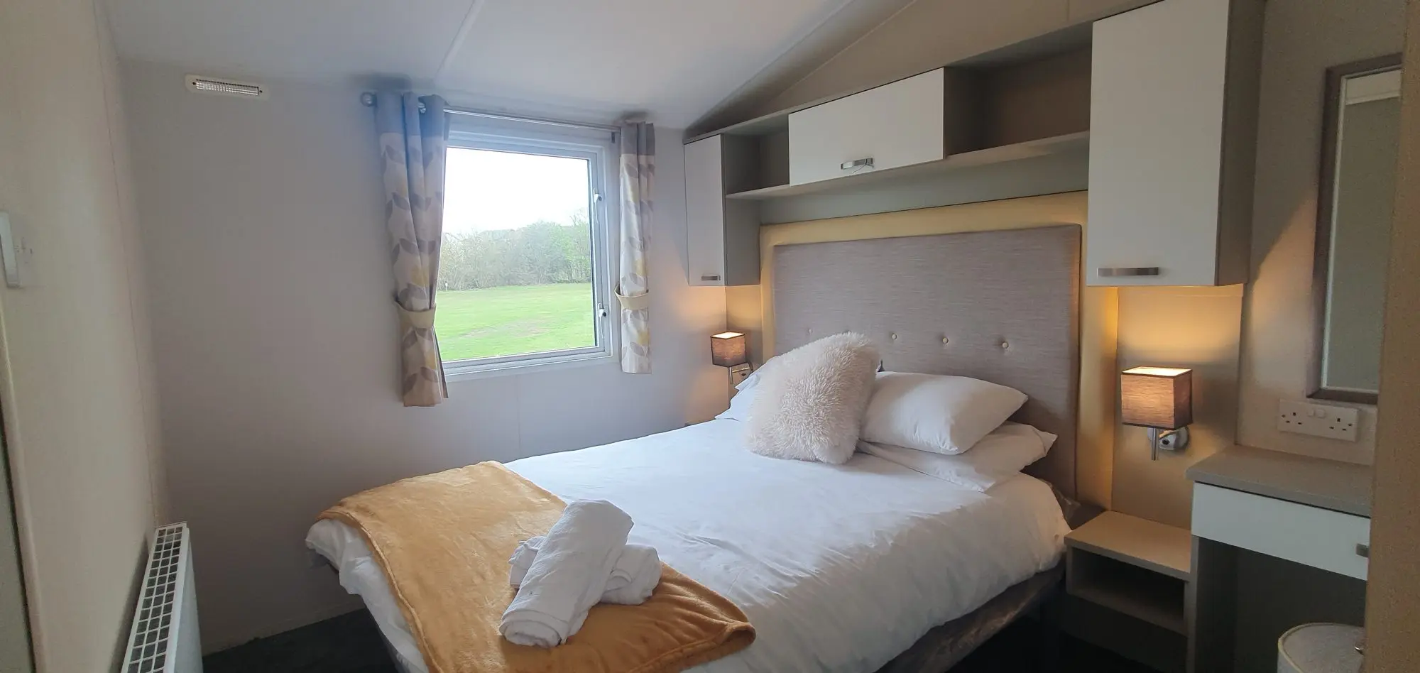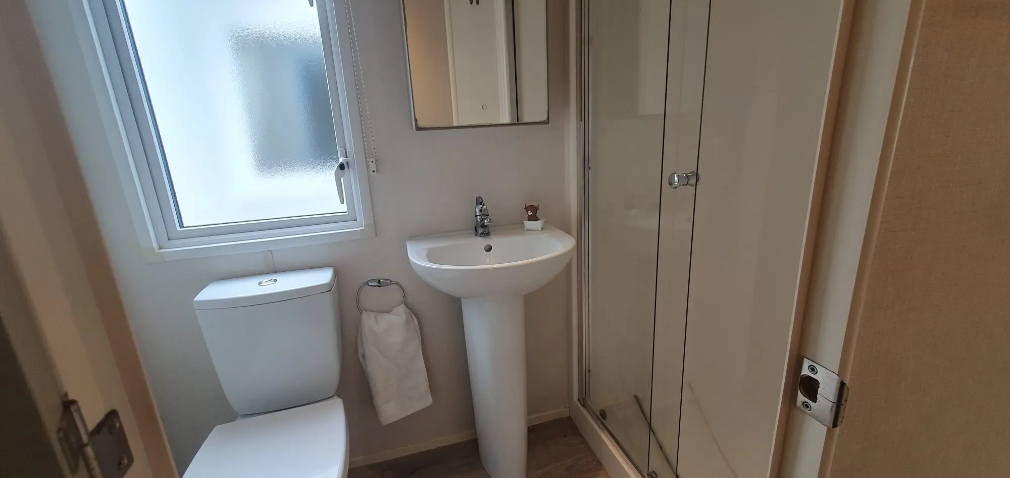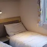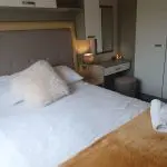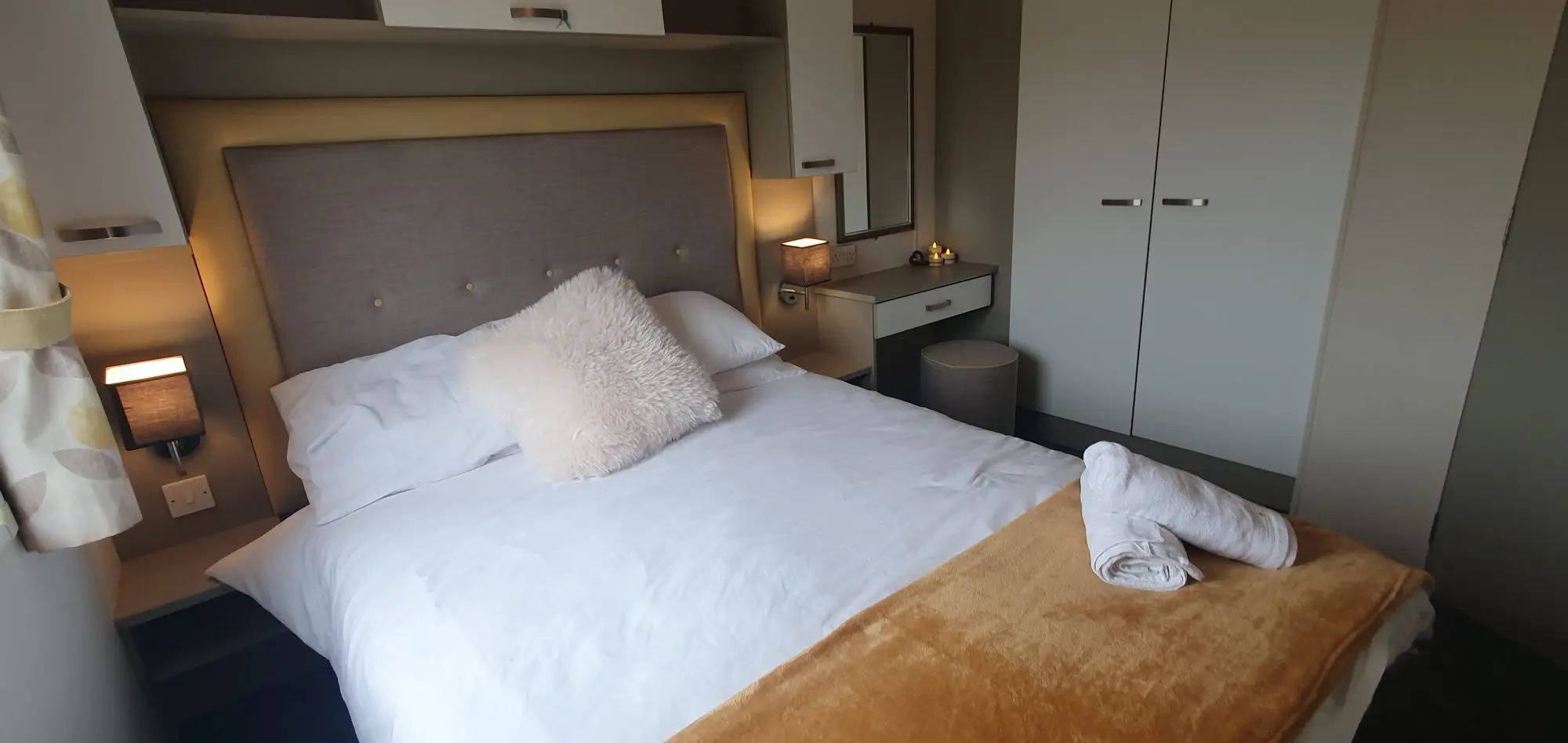 wardrobe and small dressing table with stool, ensuite WC and wash basin.