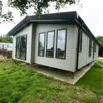 Debonair Lodge 5 illustrated is the 40ft x 20ft – 2 bedroom. This model features graphite PVC windows and doors and is finished in grey rigid feather edge PVC with feature front colour panel.
