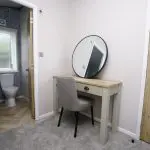 The master bedroom in the Debonair Lodge 5 is true luxury. A kingsize bed with upholstered headboard mounted on wood wall panelling is joined by a sizeable walk-in wardrobe with drawer and hanging space and a dressing table with stylish chair.
