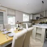The dining area in the Debonair Lodge 5 features a farmhouse-style table with 4 upholstered dining chairs and a glass fronted dresser with drawers beneath creating plenty of handy storage space.