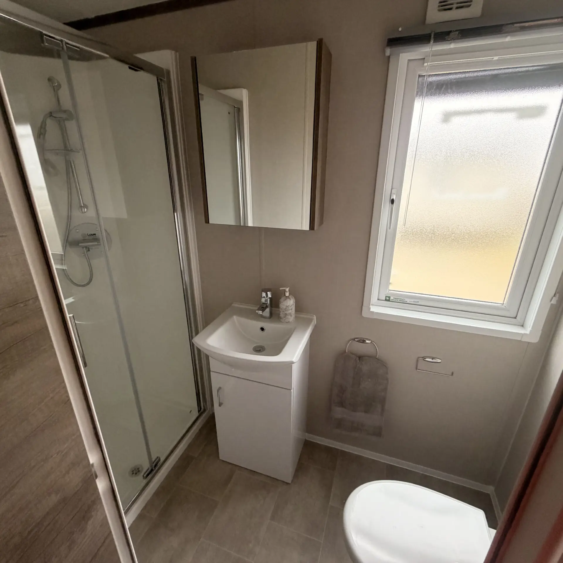 The spacious bathroom offers a modern shower and toilet, designed for comfort and practicality.