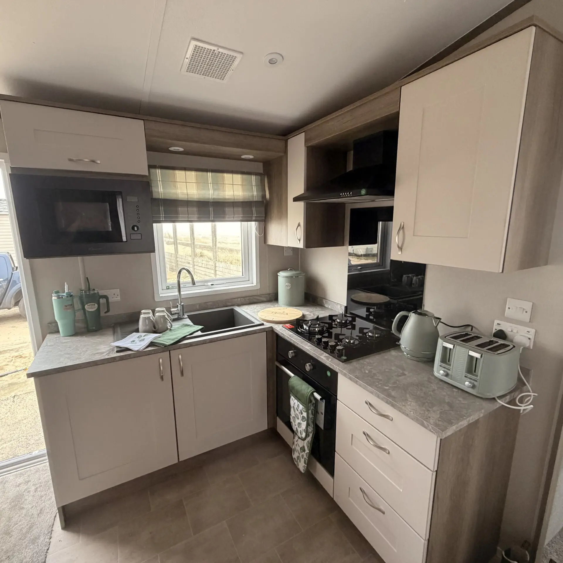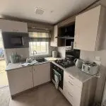 The fully fitted kitchen includes an integrated fridge and freezer, generous cupboard space, and a separate dining area complete with a stylish table and chairs – ideal for family meals or entertaining guests.
