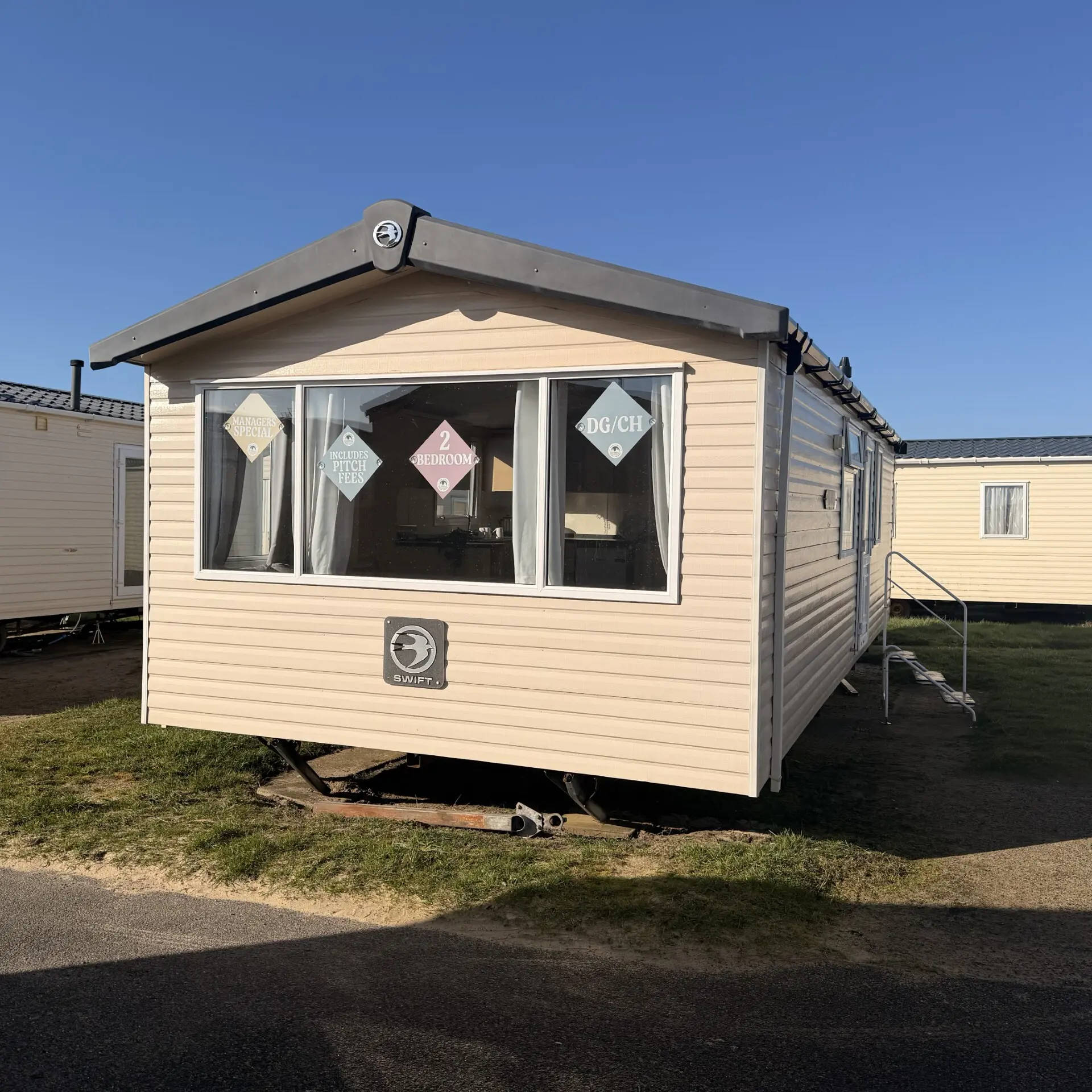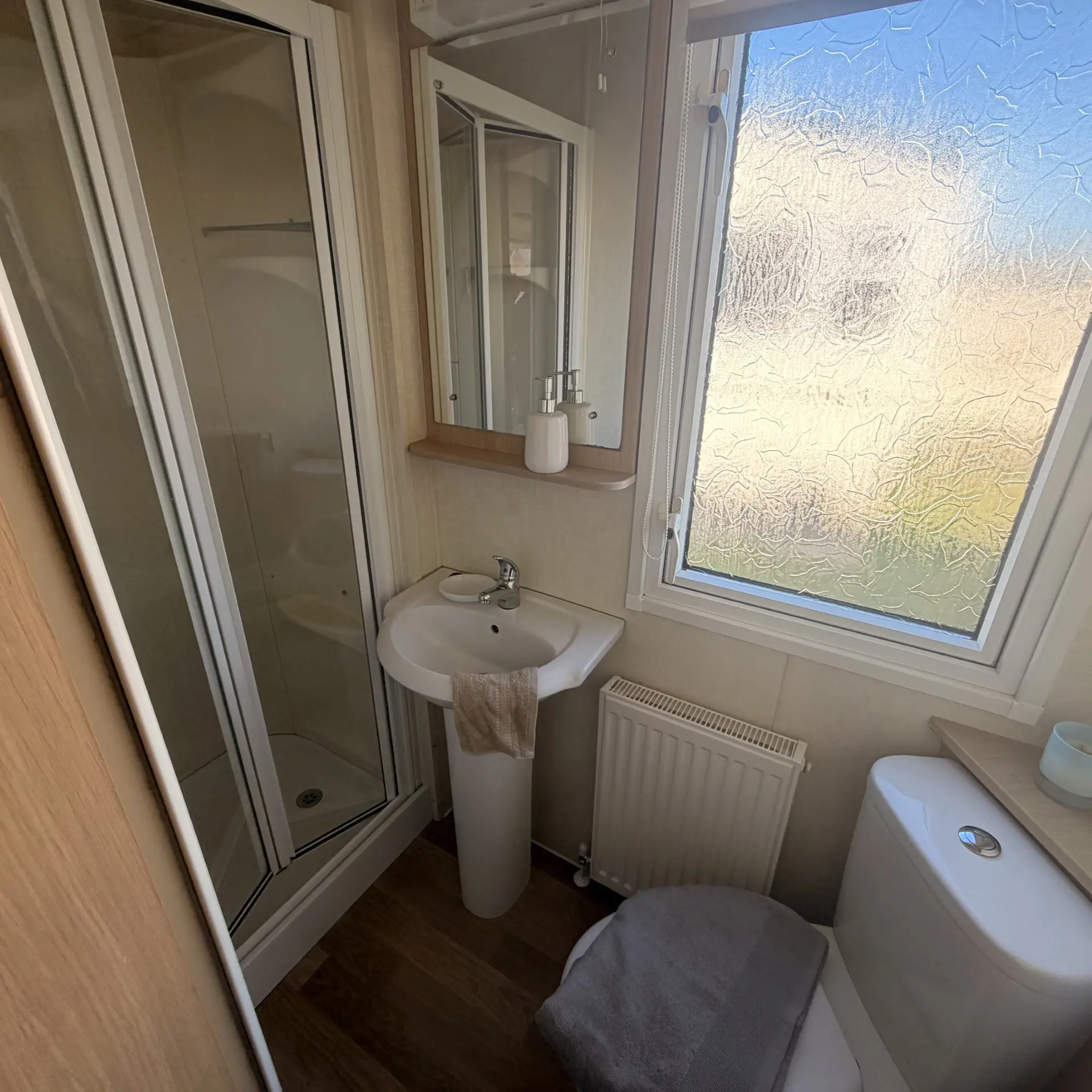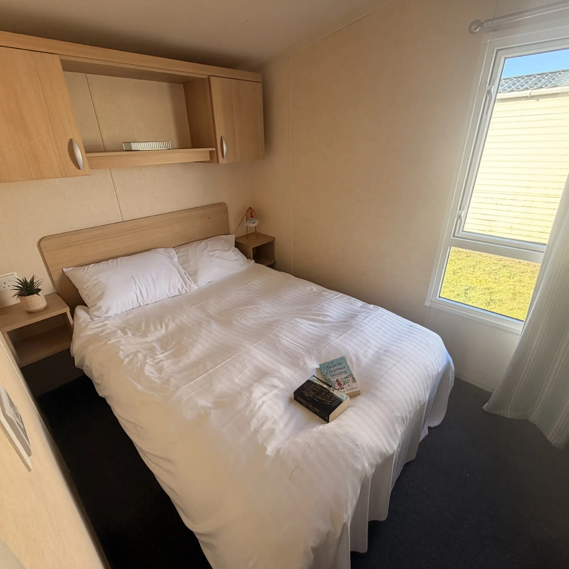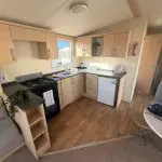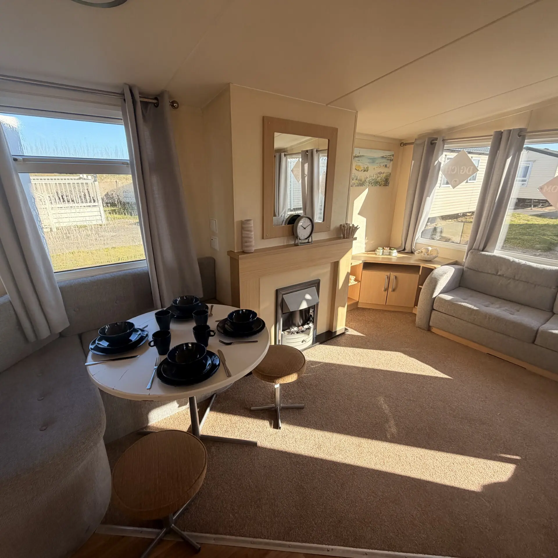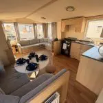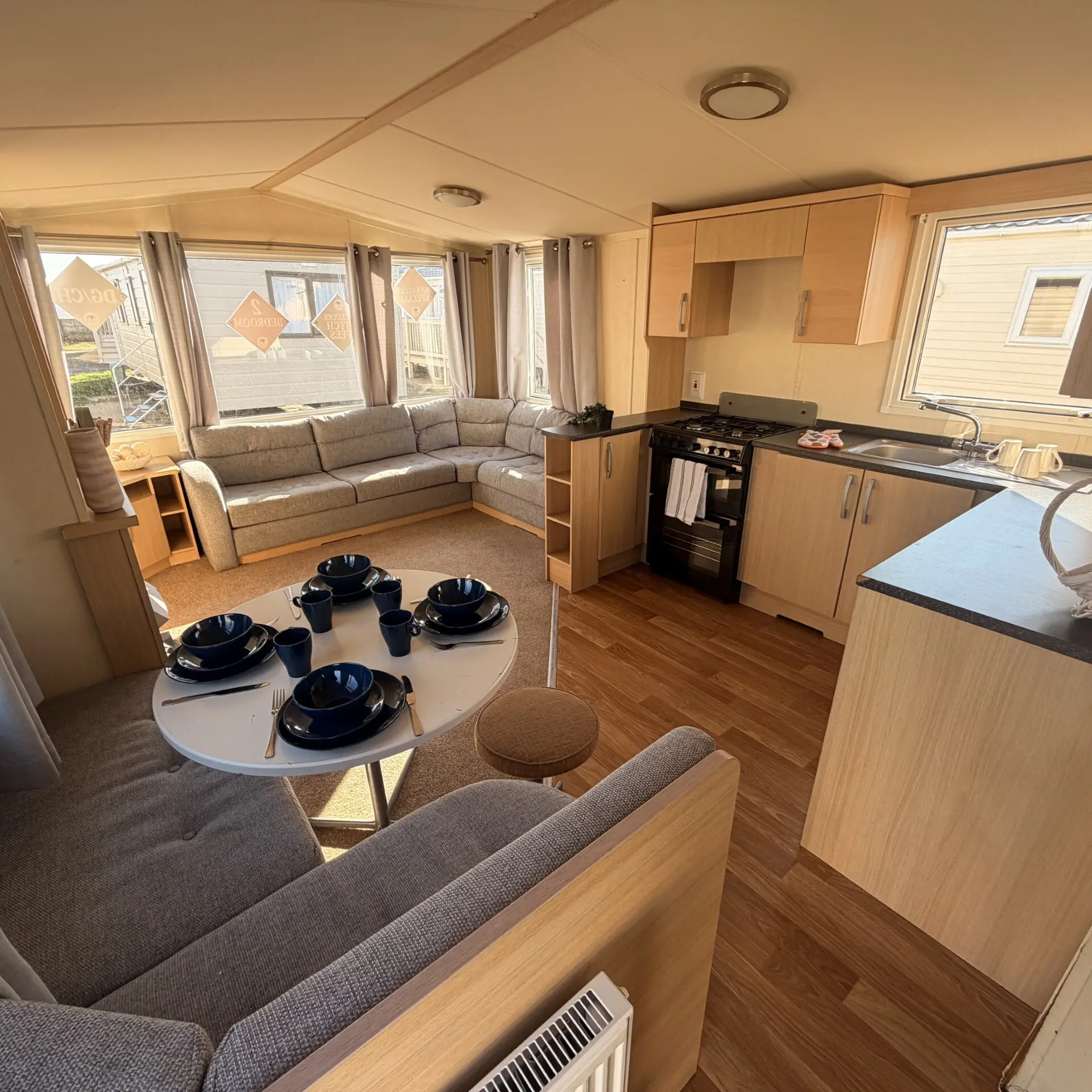 Step inside and you’re welcomed by a bright and inviting open-plan living area featuring a comfortable L-shaped sofa with a fold-out occasional bed, allowing the caravan to sleep up to six people when needed. Large windows bring in plenty of natural light, creating a warm and airy feel that makes it perfect for relaxing evenings or entertaining guests.