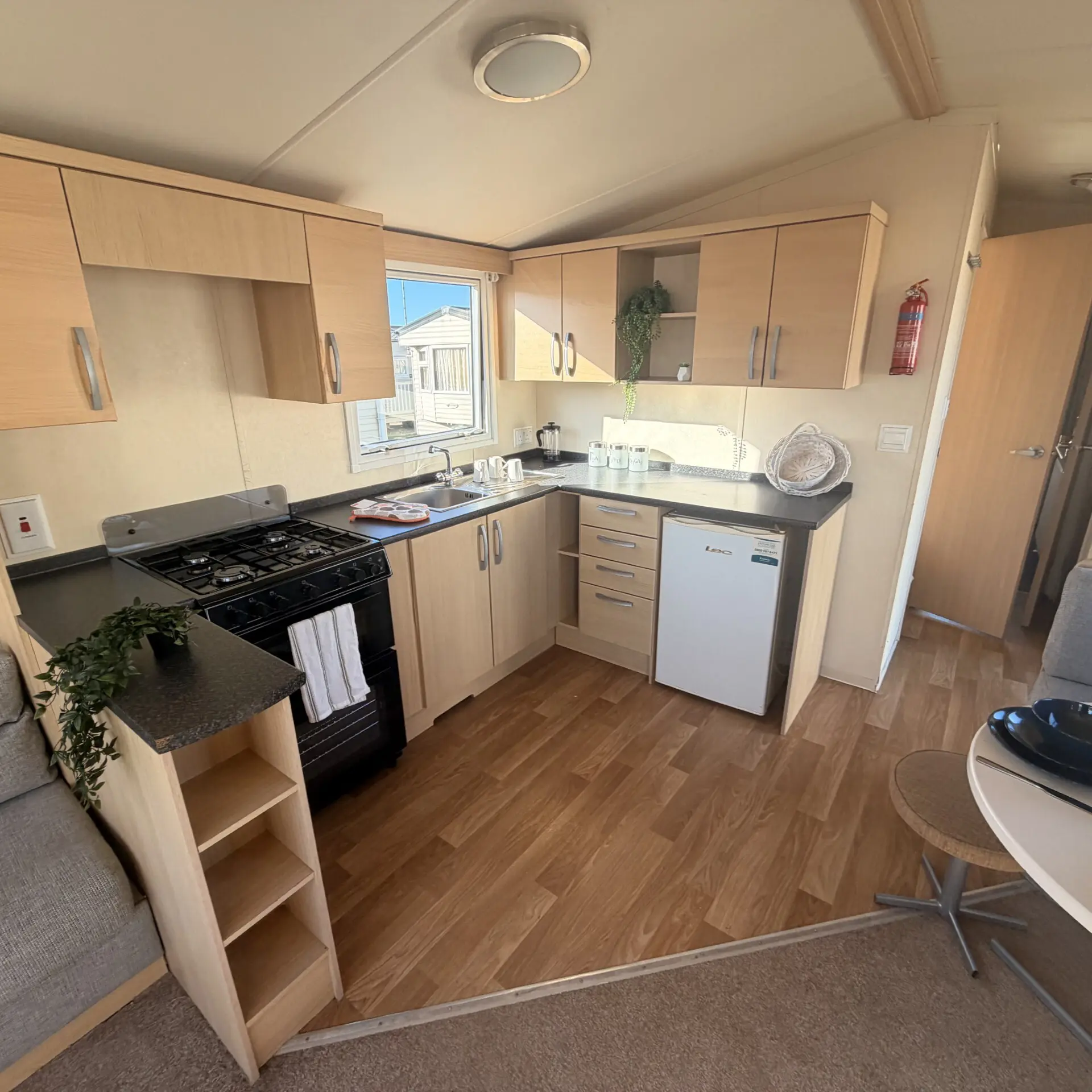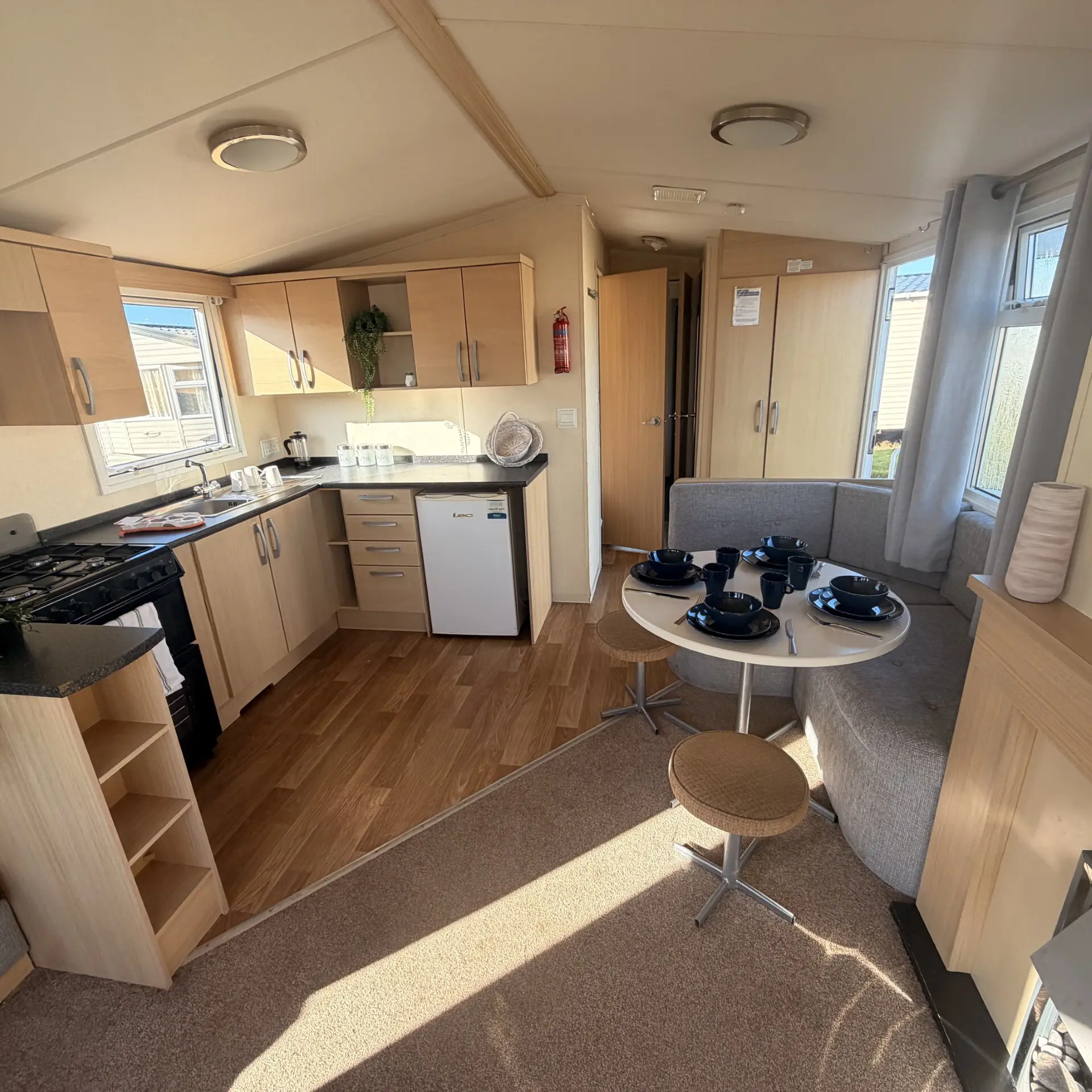 The fully equipped kitchen and dining space is designed with practicality in mind, offering generous worktop space, ample cupboard storage, a cooker with four-burner hob, and a dedicated dining table for family meals. Everything is laid out to maximise space while still providing all the essentials for comfortable holiday living.