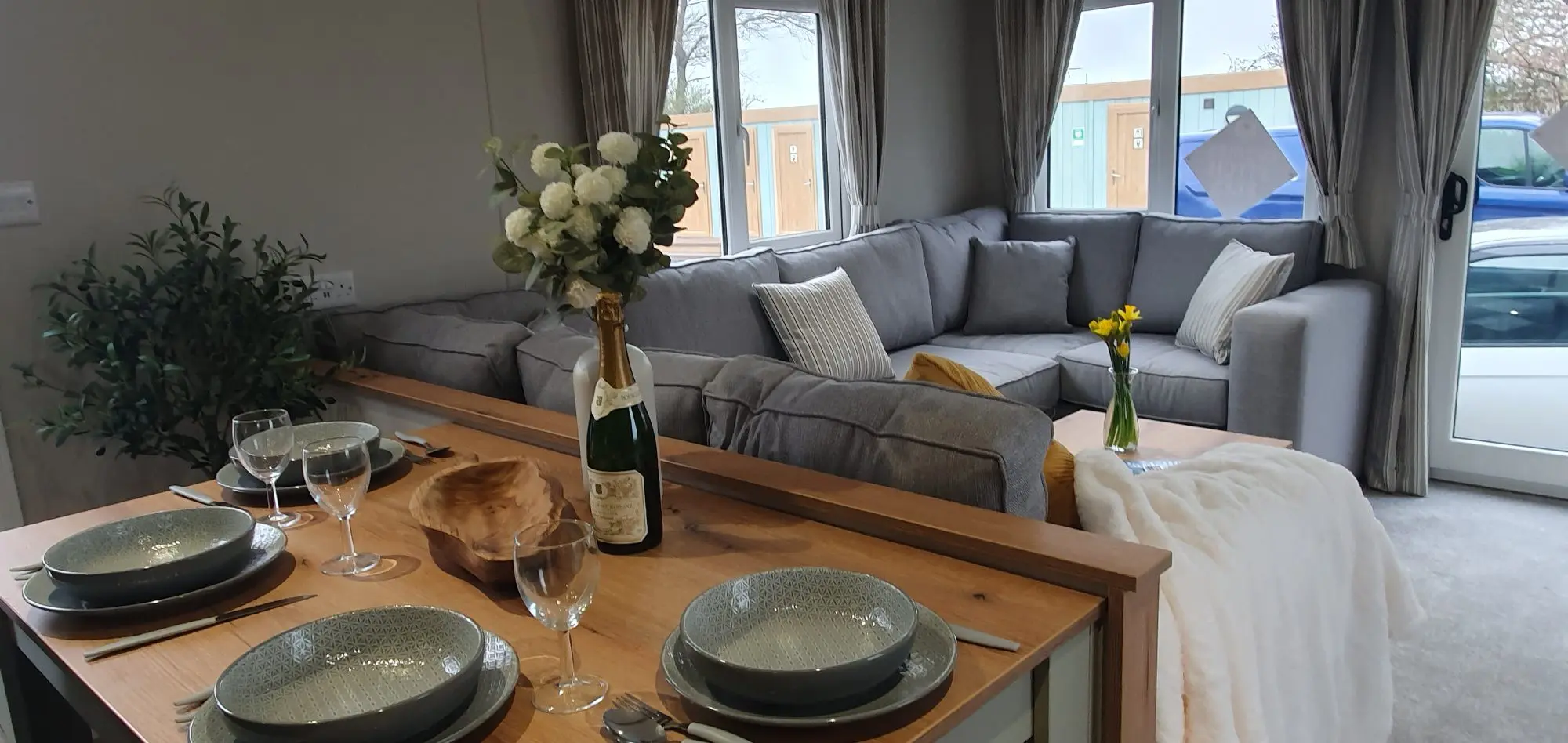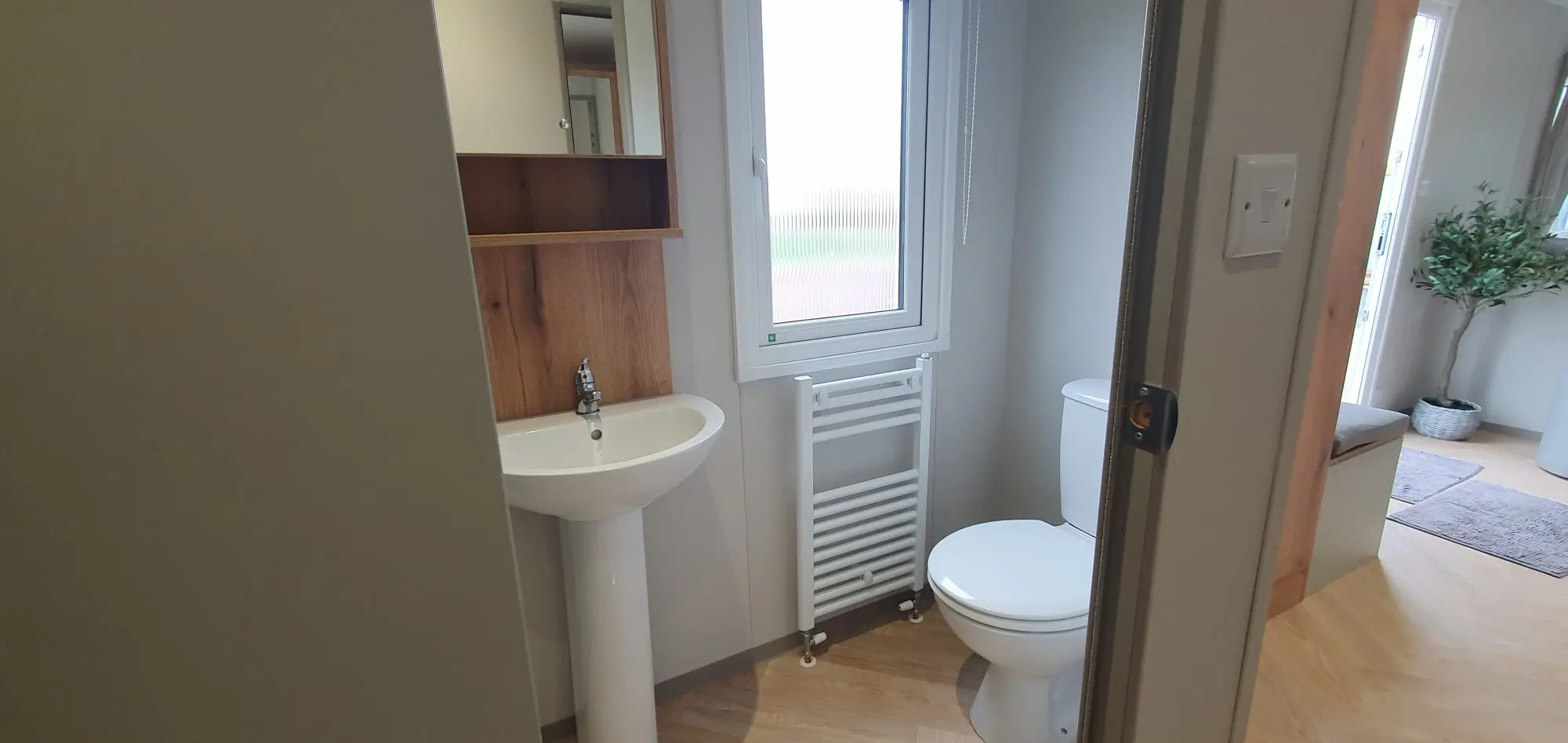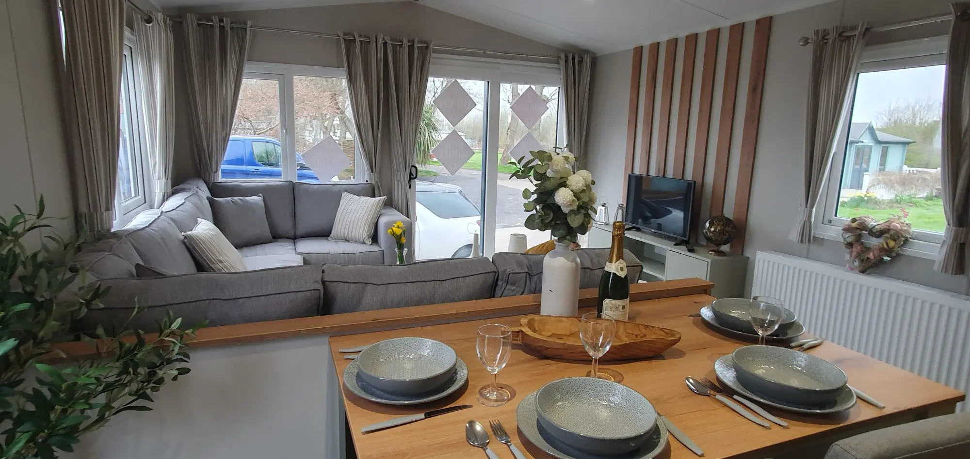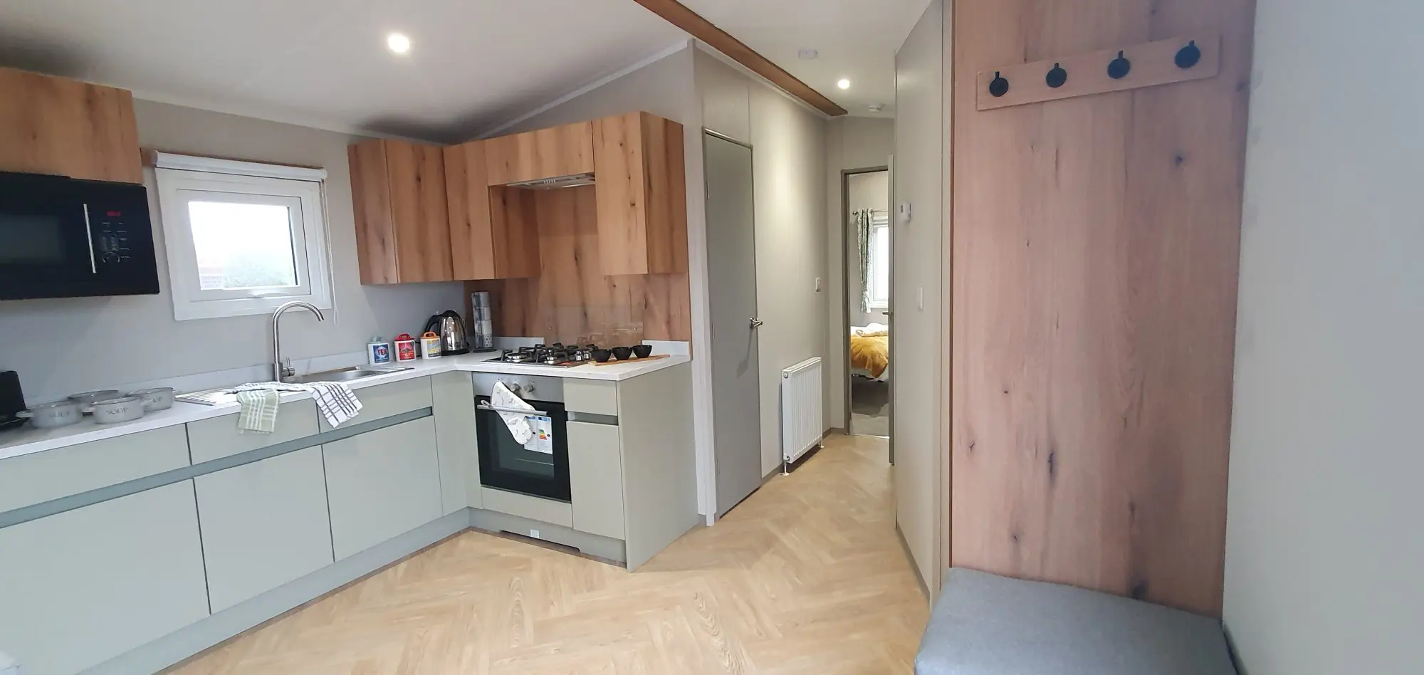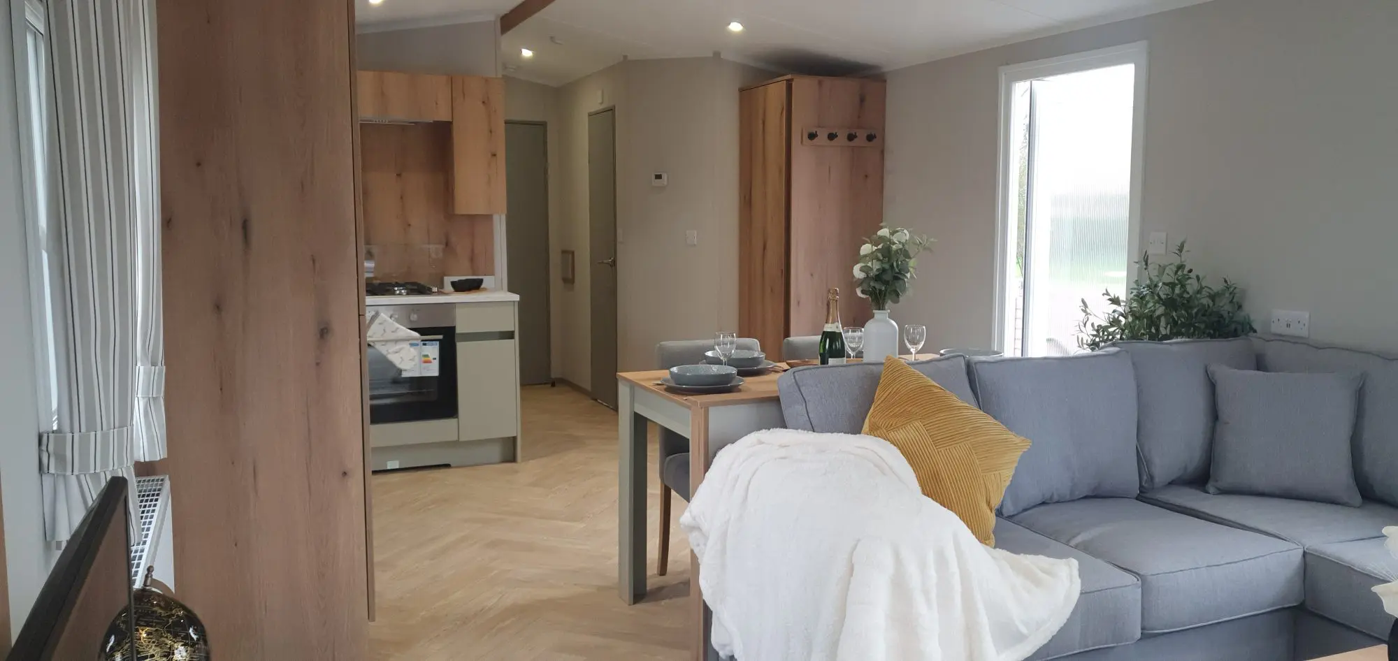 The Ashberry is a modern, sleek holiday home with patio doors to the front, letting light flood in. The natural wood and subtle grey tones in the open plan living space are complimented by the large corner sofa and functional kitchen and dining area, with a coat rack and storage seat just inside the door. The ensuite master bedroom and twin bedroom both have plenty of storage with floral accents, with a spacious shower unit in the family bathroom. This holiday home offers a luxurious way to get away from it all.