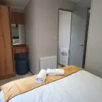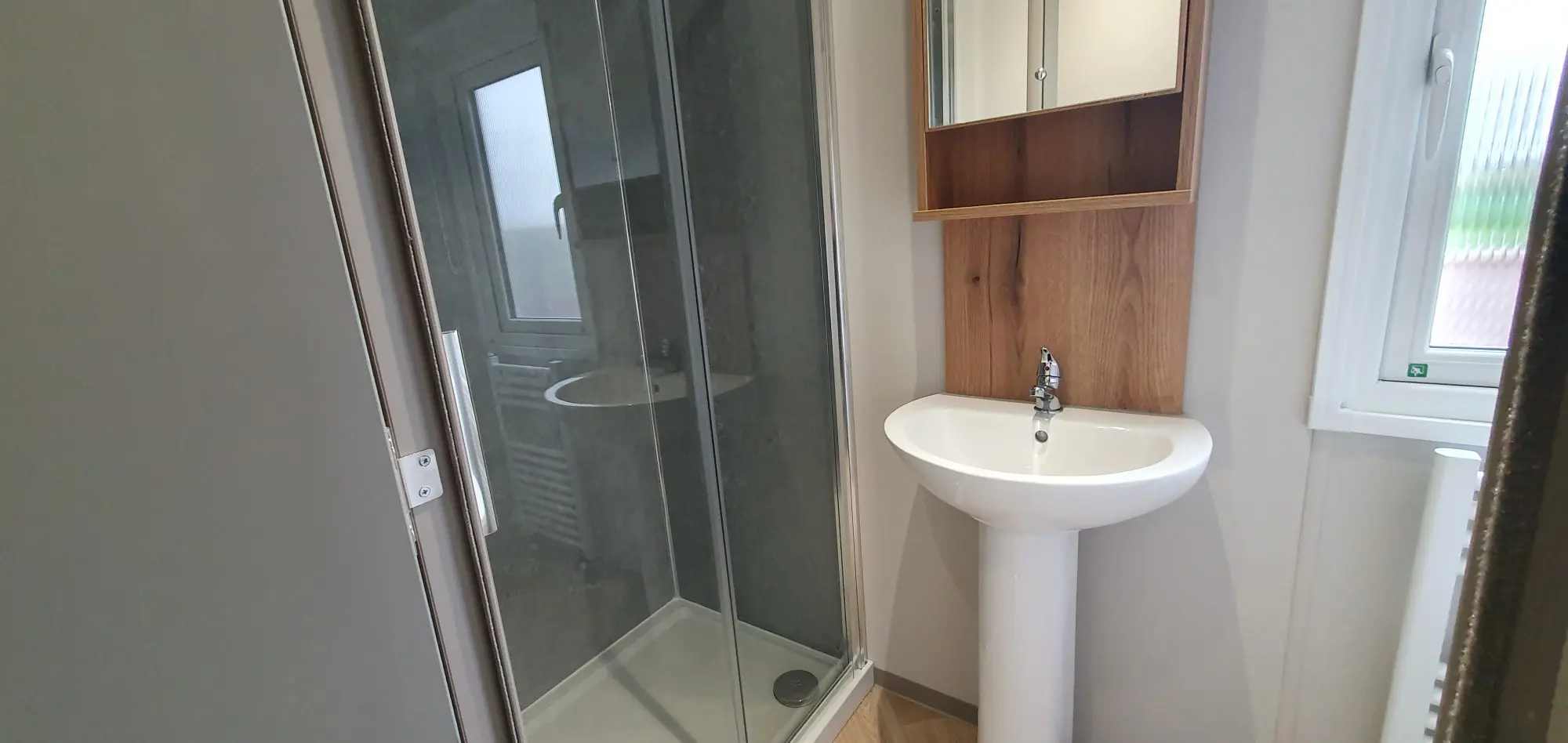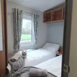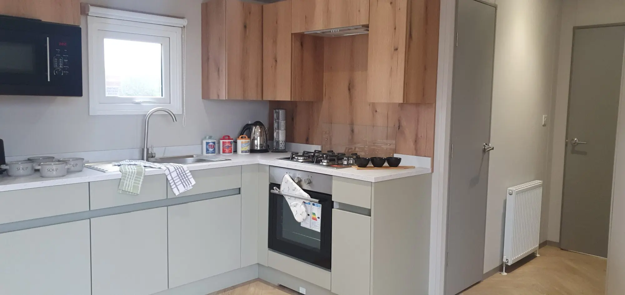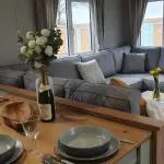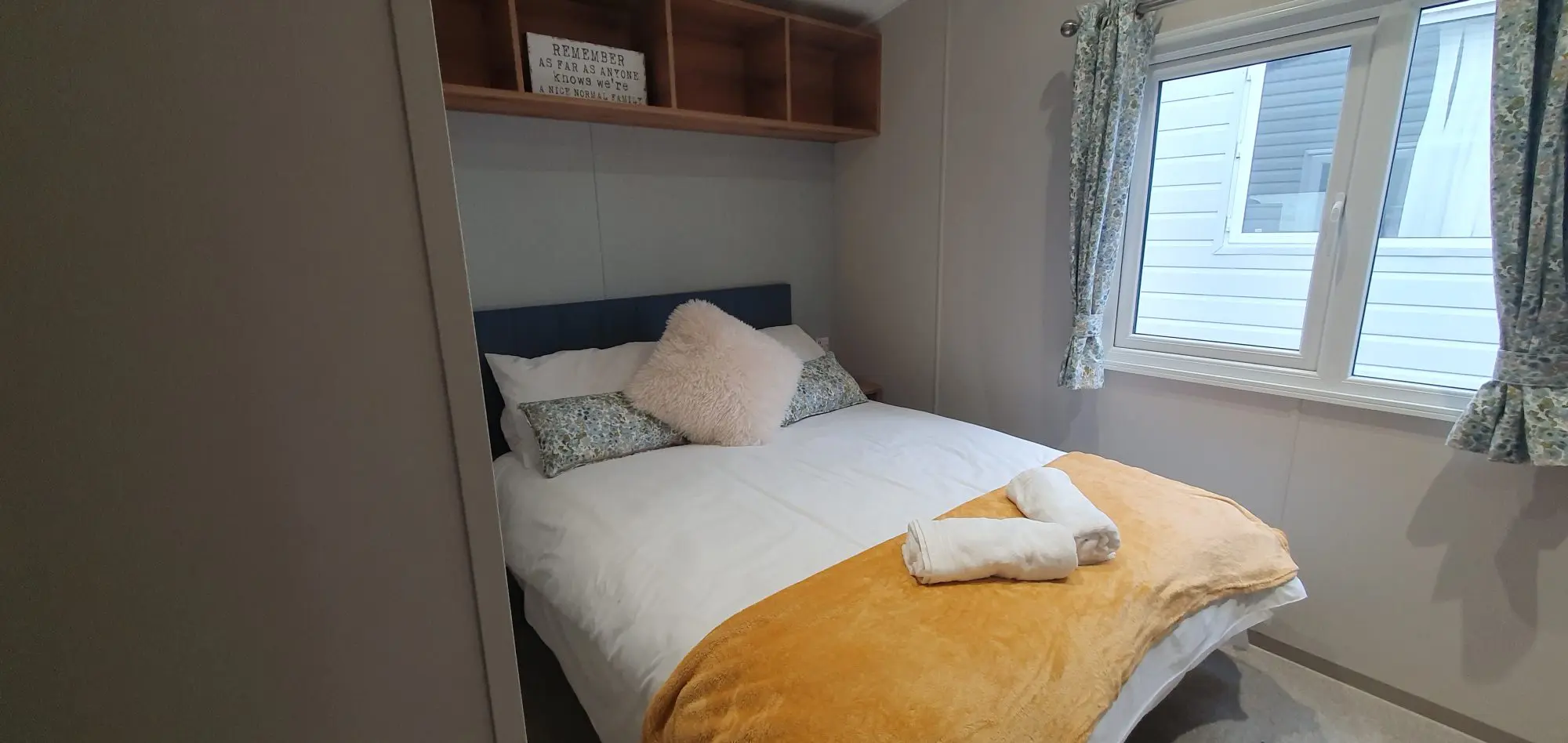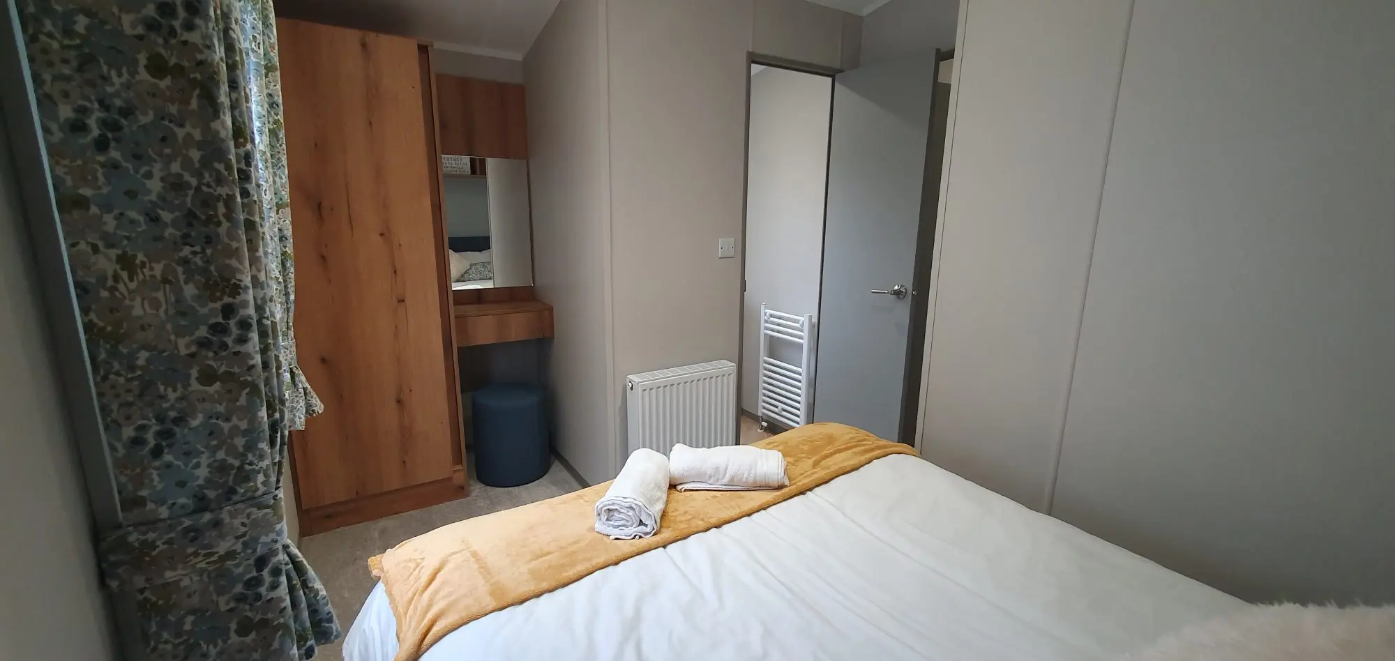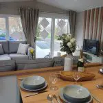 The Ashberry is a modern, sleek holiday home with patio doors to the front, letting light flood in. The natural wood and subtle grey tones in the open plan living space are complimented by the large corner sofa and functional kitchen and dining area, with a coat rack and storage seat just inside the door. The ensuite master bedroom and twin bedroom both have plenty of storage with floral accents, with a spacious shower unit in the family bathroom. This holiday home offers a luxurious way to get away from it all.